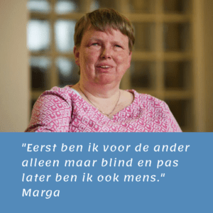 “Mensen vragen zich af hoe ze met je om moeten gaan, zoeken voorzichtig  contact en vragen of je hulp nodig hebt. Ik zeg wel eens gekscherend: eerst ben ik voor de ander alleen maar blind en pas later ben ik ook mens”, zegt Marga. “Maar de ander wil graag helpen en dat er rekening met je gehouden wordt, is al fijn. Omzien naar elkaar is zo ontzettend belangrijk!